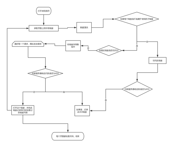 实现这样的功能,大致分为以下步骤: 1.打开官网首页,获取页面上所有的链接。 2.添加规则对这些链接过滤,把外链去掉。 3.遍历访问这些链接,打开打开其中的每一个链接,检查是否为404,如果是距离下来。 4.重复执行1,2,3。直到把整个网站所有的链接都遍历完。