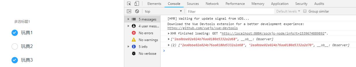 我选择了两个选项,但是v-model中绑定的数组只有一个,解决这个问题如下代码