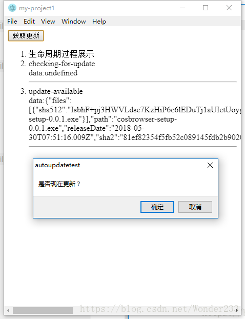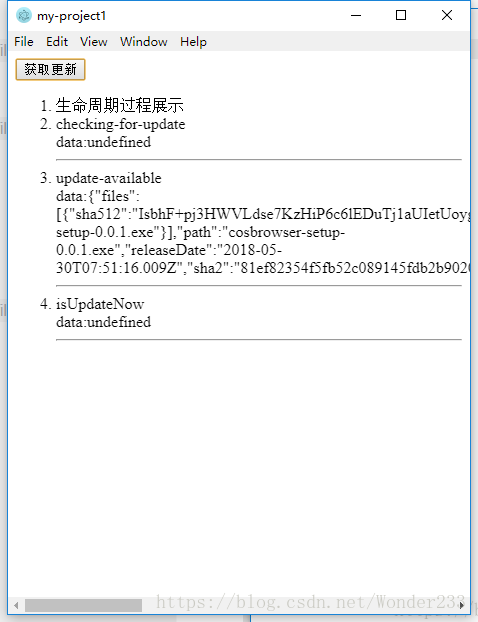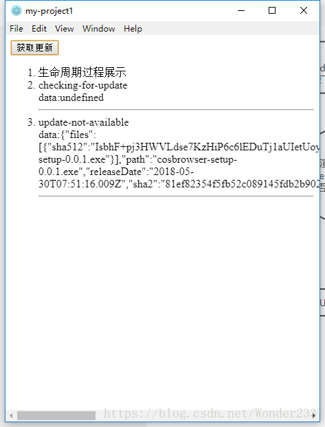 3.将 package.json 中的版本号改回0.0.0,再npm run build一遍,运行 build 文件夹下的 exe 安装包,就将软件安装在你电脑里面了。点击安装完成后桌面上的快捷方式,再次点击上面的获取更新的按钮就可以看到显示在界面的自动更新生命周期了。(但这里因为会给你直接自动更新,所以会一闪而过,你可以在 autoUpdate 的各个生命周期事件里设置主进程与渲染进程通信,则可以一步一步观察到整个自动更新的生命周期了。)