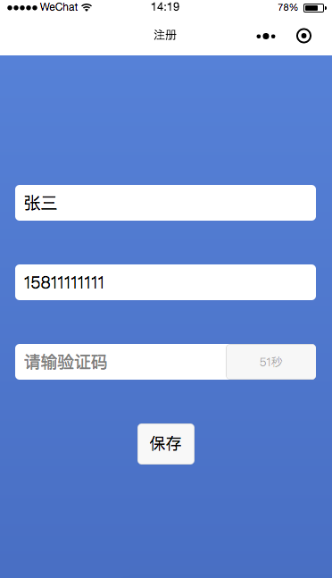 微信小程序注册完整实例,发送短信验证码,带60秒倒计时功能,无需服务器端。效果图: