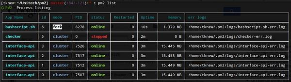 列出由pm2管理的所有进程信息,还会显示一个进程会被启动多少次,因为没处理的异常。