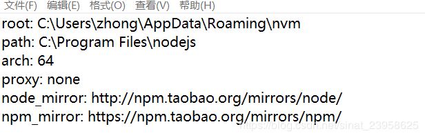 root: C:\Users\zhong\AppData\Roaming\nvm path: C:\Program Files\nodejs arch: 64 proxy: none node_mirror: http://npm.taobao.org/mirrors/node/ npm_mirror: https://npm.taobao.org/mirrors/npm/