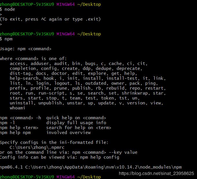 依次执行node,npm命令,出现下面结果代表成功了