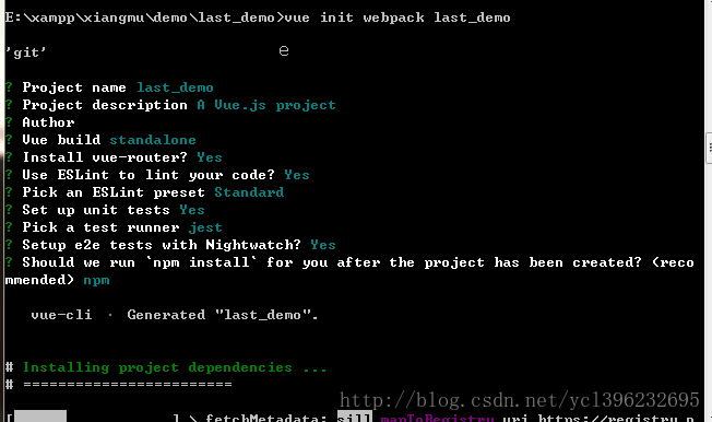 vue init webpack last_demo 然后等一下就会出现相关的信息,再自己去选择安装的一些设置