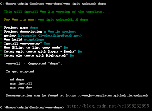接下来新建项目,运行 vue init webpack demo 这里的demo是你项目的名字,接下来会有一些初始化的设置,其中vue-router是路由,反正我都会选择安装,其他的可以回车跳过或者选择no