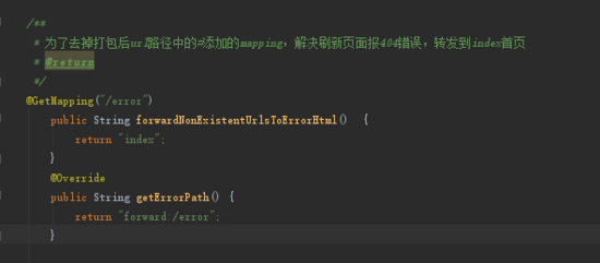 这种情况下,我将vue的路由改为history模式,地址中的#去掉了,但是也会出现上面所说的,刷新页面时报404错误,前端路由交给了后端去处理造成mapping匹配不上导致。