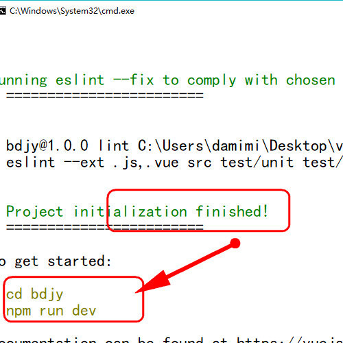 4、接着便可看到依赖包已经配置成功了。可以用cd来进入项目里边并执行npm run dev即可启动刚才初始化搭建的项目了。