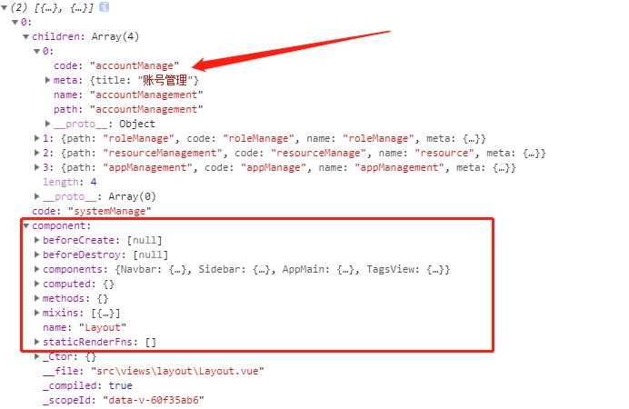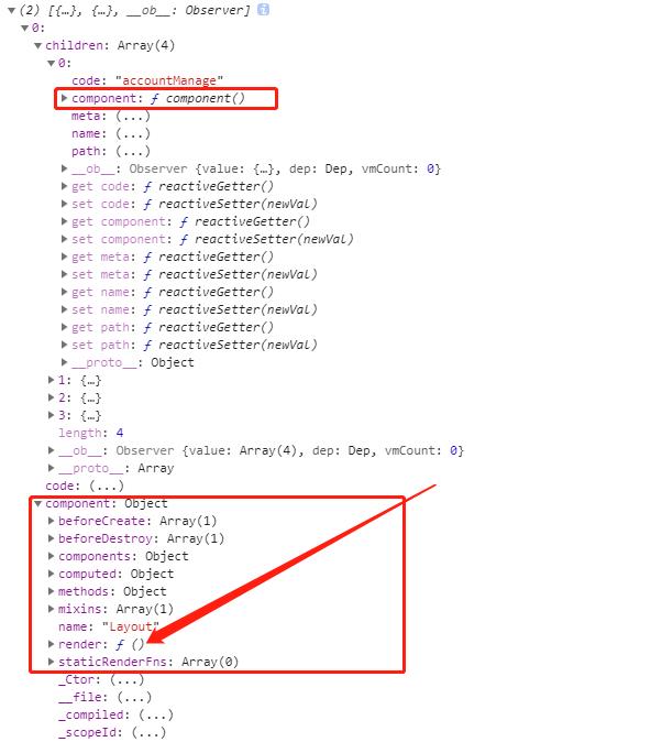 从两张图上红色矩形圈圈可以看出,从缓存中读出来的路由信息已经发生了改变,父路由中的render方法也没有了(第一张图中父路由的render方法还是有的,到了第二张就没有了),且子路由children里边已经没有了component属性(从第二张图中的红色箭头处可以看出),这显然不是我们想要的路由信息。有人说可以使用import xxx from ‘xxx'来替代component的值,这个针对父路由的component都引用了同一个Layout组件来说是可以的,但是子路由呢?从缓存中读出来的子路由连component都没有了,即使是有这个属性,但子路由都引用了不同的component,那你怎么玩?况且将过滤后的路由信息通过缓存的存取来实现,安全上就会有问题,因为如果户手动修改了缓存里的路由,那你所谓的动态路由权限岂不是立马破功了。