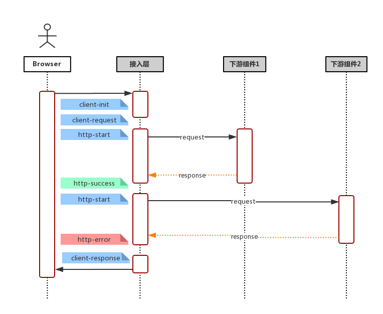 结合一般常见的请求链路(用户请求,服务侧接收请求,服务请求下游服务器/数据库(*多次),数据聚合渲染,服务响应),如下方的流程图
