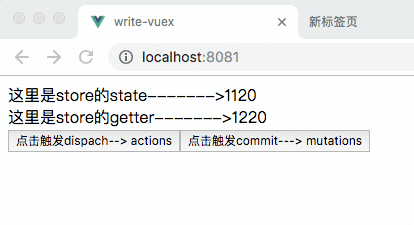 配置选项都写好之后,就看到getters对象里面有个newCount函数,mutations和actions对象里面都有个change函数,配置好store之后我们在App.vue就可以写上,dispatch和commit,分别可以触发actions和mutations,代码如下