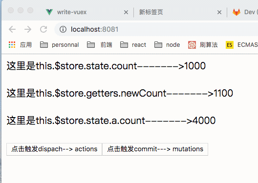 然后就可以在界面上就可以写上this.$store.state.a.count(显示a模块count),this.$store.state.a.b.count(显示a模块下,b模块的count),这里还有一个要注意的,其实在组件中调用this.$store.dispatch('change')会同时触发,根的actions和a模块的actions里面的change函数。