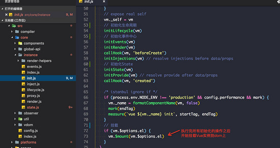这里的$mount是一个public mount method。之所以这么说是因为Vue有很多构建版本, 有些版本会依赖此方法进行有些功能定制, 后续会解释。