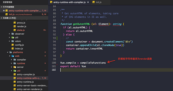 关于compileToFunctions函数, 在src/platforms/web/entry-runtime-with-compiler.js中可以看到会挂载到Vue上作为一个全局方法。