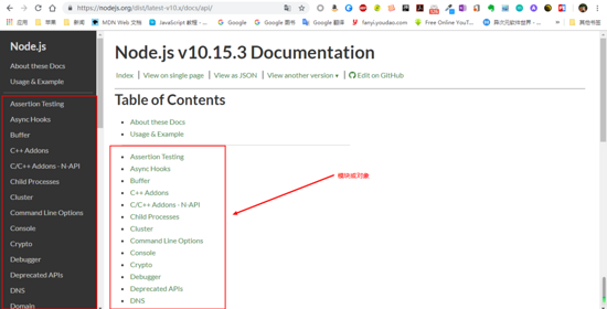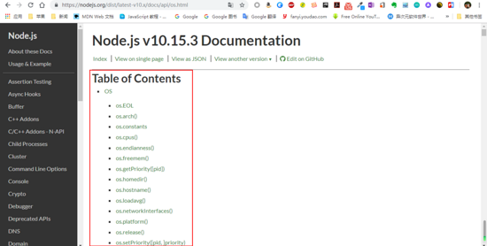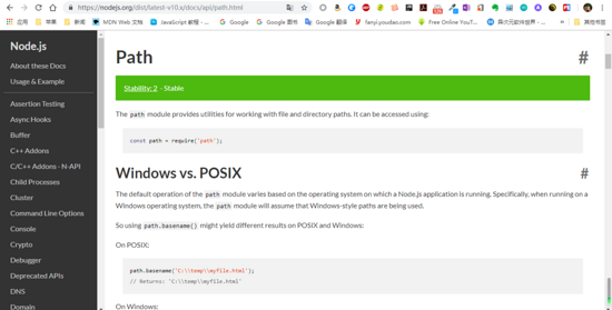 在 node 核心中有些内建模块,使用这些模块可以操作系统,文件和网络。打开 nodejs.org 官网可以看到文档中对应版本的 API ,推荐使用稳定版。