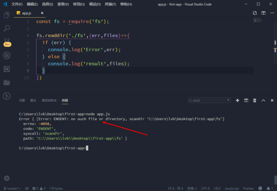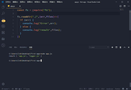 我们得到了一个字符串数组,是这个文件夹中的文件。 好了,我们尝试再使用异步的方法看看,第一个参数是路径,第二个参数是回调函数, node 会在异步操作完成后自动执行函数。