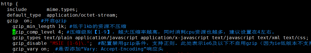 在上一步前端就已经配置好了,之后就是nginx配合开启gzip模式,这个比较简单,只要你对nginx有一点了解,我们在nginx.conf中的http中配置一些代码