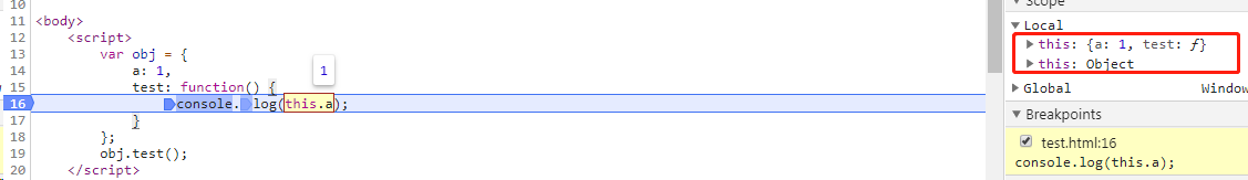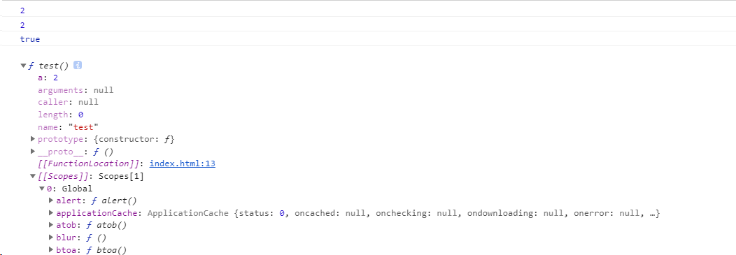 在上面这段代码中,我们在全局声明一个方法test,给test中的a属性赋值1,当前方法中的this中的a属性赋值2,加入this指向函数自身,那么test.a === this,a并且都等于2.
