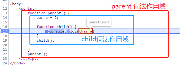 假如this指向函数的词法作用域,那么child方法中的this.a应该是存在,实际上的执行结果如下: