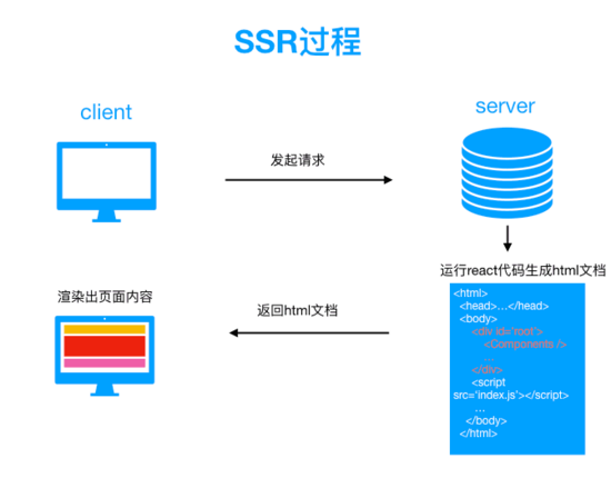 过程:浏览器发送请求 -> 服务器运行 react代码生成页面 -> 服务器返回页面 -> 浏览器下载HTML文档 -> 页面准备就绪 即:当前页面的内容是服务器生成好给到浏览器的。