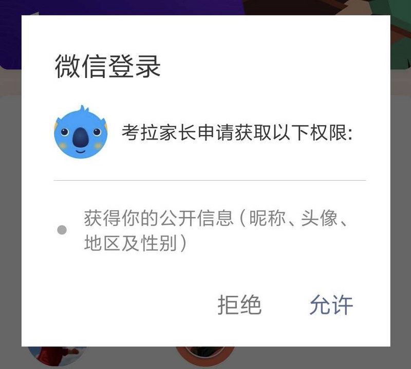 -scope=snsapi_userinfo 获取微信用户详细信息(昵称,头像等),需要用户手动点击授权,当点击允许时,会跳转业务页面(类似于关闭弹窗),点击拒绝时会推出页面,授权如图: