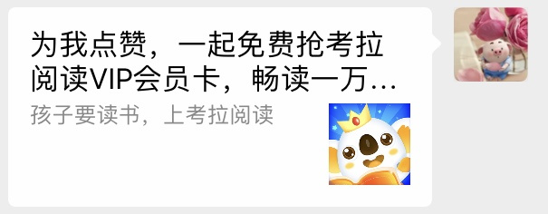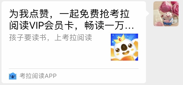 title: "为我点赞,一起免费抢考拉阅读VIP会员卡,畅读一万本好书~", // 分享数据配置