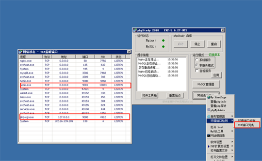 开始部署时,使用的是9000端口,一直运行不起来,后面发现phpstudy启动是php-cgi.exe默认就使用了9000端口。关于端口使用情况,phpstudy也提供了工具。