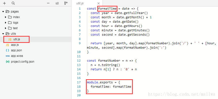 工具栏utils.js:存放常用的工具函数,例如日期格式化、时间格式化函数。定义后通过module.exports注册,在其他页面才可以使用。