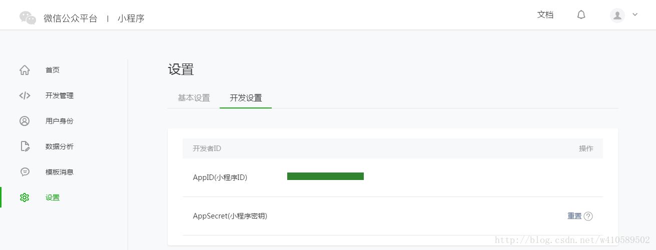 注:获取accesstoken的方法跟微信公众获取accesstoken方法一致,不过小程序获取accesstoken需要小程序的appid和appsercet。登录 https://mp.weixin.qq.com ,就可以在网站的“设置”-“开发者设置”中,查看到微信小程序的 AppID 了,注意不可直接使用服务号或订阅号的 AppID 。