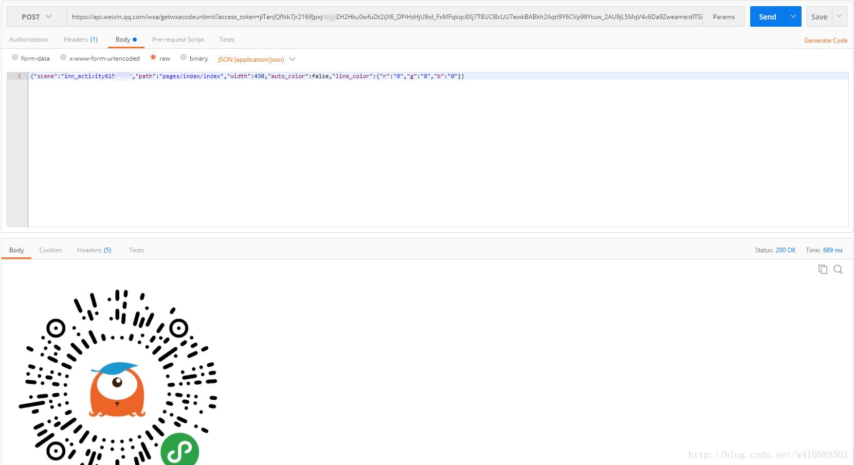 接口地址:https://api.weixin.qq.com/wxa/getwxacodeunlimit?access_token=ACCESS_TOKEN