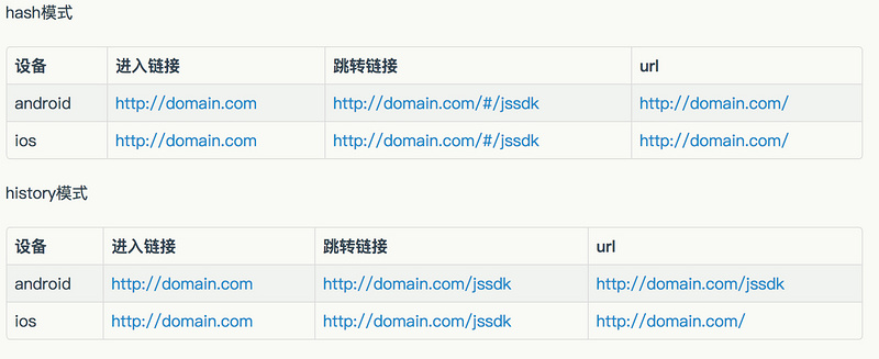 上篇文章,我推荐大家在vue中配置vue-router使用hash模式,那么hash模式和history模式到底有什么差别呢?我举个栗子,假设我们都通过http://domain.com进入,然后跳转到路由为/jssdk的页面需要用到jssdk,那么实际js-sdk进行签名校验时所获取的当前页面url在ios和andrioid是不同的,这里我通过表格展示出来: