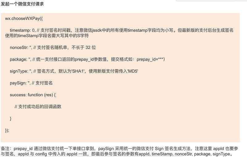 如果你只需要在公众号中调用支付,两个方法都可以,笔者由于已经使用js-sdk接入了其他功能,所以这里就选择了chooseWXPay方式。