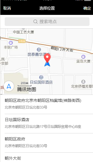 点击选择位置按钮,首次调用还需要获得用户的scope.userLocation授权: