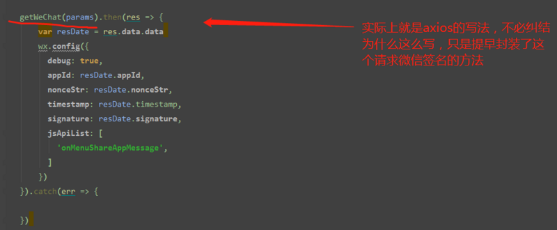 然后就直接去请求签名,写法就不深究,getWeChat是封装的axios,只是为了统一管理才这么写,大家可以写成正常的请求axios('xxxx.com/get-wx',obj).then()这样的写法,一样的效果