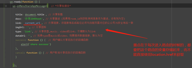 重点关注再与这个link,需要在每次分享的时候记录当前的路由,如果直接读location.href在IOS端的时候会是第一次进入的页面。安卓则没有问题,所以我统一采用我记录的这个参数,这个参数可以直接在方法传递过来,路由afterEach的to.fullpage,然后再加上自己的域名就OK了最后写几句话,希望大家都能顺便解决一下BUG,也希望能对大家有所帮助,如果遇到一些其他的问题,欢迎评论区留言,只要有时间就会及时跟大家交流探讨!也希望大家多多支持脚本之家。