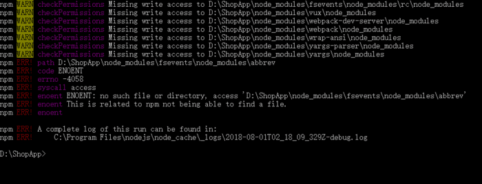 npm ERR! enoent ENOENT: no such file or directory, access 'D:\ShopApp\node_modules\fsevents\node_modules\abbrev'