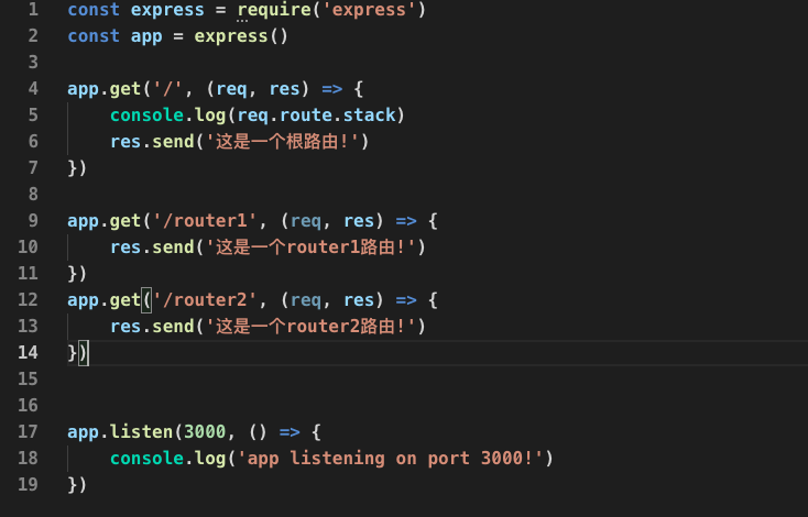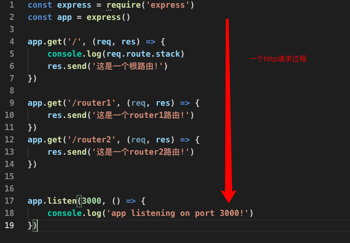 如果我们启动服务,访问'/'路由,会返回"这是一个根路由",访问router1路由就会得到这是一个"这是一个router1路由的"的信息。这看起来是一个很简单的路由查询,我们理一下过程,这个请求是如何访问到这个路由的呢。