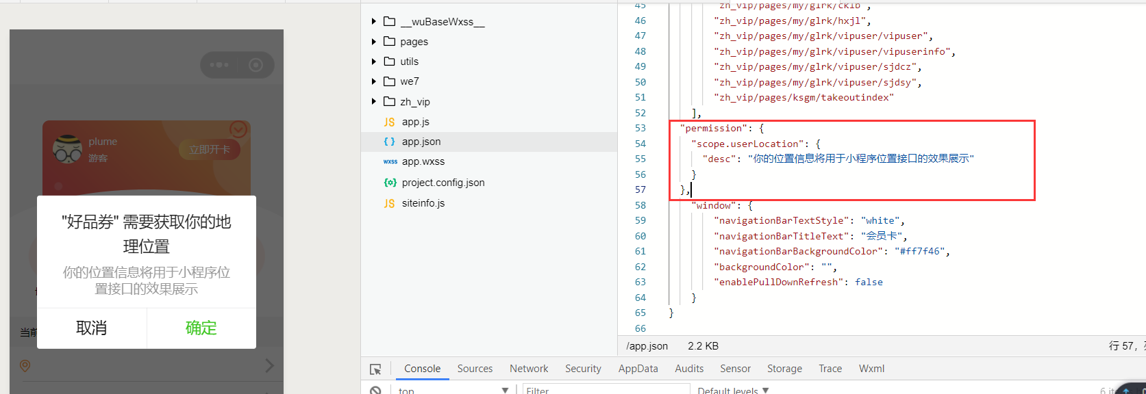 编译,如上方弹出“getLocation需要在app.json中声明permission字段”