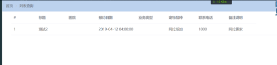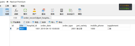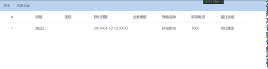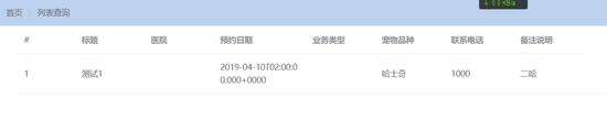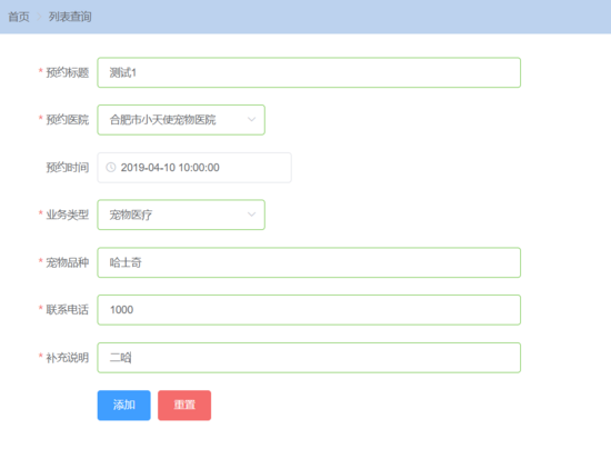 添加的预约记录:{"id":null,"title":"测试1","hospitalId":1001,"orderDate":"Wed Apr 10 10:00:00 CST 2019","orderType":2001,"petVariety":"哈士奇","mobilePhone":"1000","supplement":"二哈"}