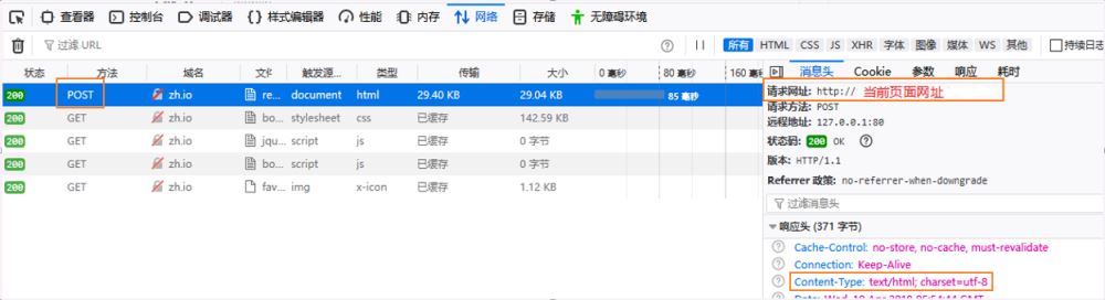 在右侧消息头处可见,请求网址为当前网址,并且响应头部类型为html