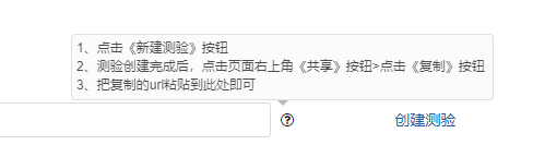 <div class="s2" ng-init="InitTooltip()"> <input type="text" ng-pattern="/^(http|https|ftp)\://[a-zA-Z0-9\.\,\?\'\\/\+&%\$\#\=~:_\-\s@]+$/" class="inputwords" id="txtExamination" name="txtExamination" ng-model="csInfo.ExamUrl" placeholder="测验地址"> <span data-toggle="tooltip" data-placement="top" data-html="true" title="1、点击《新建测验》按钮 <br/> 2、测验创建完成后,点击页面右上角《共享》按钮>点击《复制》按钮 <br/> 3、把复制的url粘贴到此处即可" style="cursor: pointer;"> <i class="fa fa-question-circle-o examSpan"></i> </span> <span style="margin-left: 88px; width: 8px;"> <a target="_blank" href="https://forms.office.com/Pages/DesignPage.aspx">创建测验</a></span> </div>