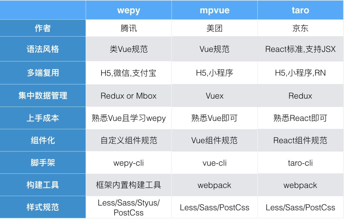 在这里我通过对目前已开源的三种常用小程序框架做一个综合对比, 还有一个叫nanchi的基于react的小程序转译框架,由于没来的及研究暂不做比较;