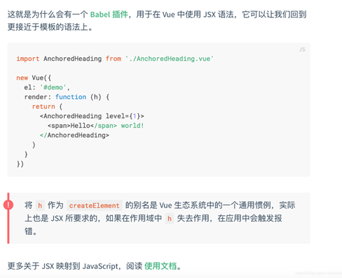 或许你会发现,这个原生的createElement 写起来并不简单,而且很费事,我们也可以采用JSX的方式,这个在Vue官方文档中有提到