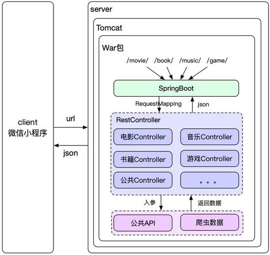 后端主要是提供给小程序数据接口,让小程序各个页面都能有排行榜数据展示,这里我提供的是http接口,返回的Json格式的字符串。使用的语言是Java,使用的框架是SpringBoot,将最终的java代码打包成war包部署在云主机上的web服务器Tomcat中,Tomcat就可以自动的将通过url过来的请求分发到我的程序代码的处理逻辑中,处理完请求拿到相应的数据则以Json字符串的格式返回。