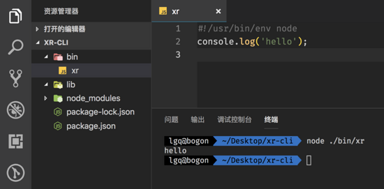 这个文件就是我们整个脚手架的入口文件,我们用 node ./bin/xr 运行一下,就能在控制台打印出 hello,如下图: