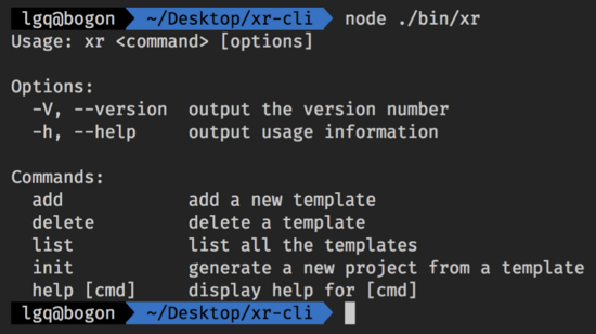 这个文件的主要作用就是定义指令,现在我们用 node ./bin/xr 运行一下,就能看到如下结果:
