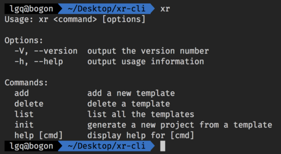然后在根目录下执行 npm link (就是把命令挂载到全局的意思),这样我们每次只要输入 xr,就可以直接运行了,so cool,就像下面这样: