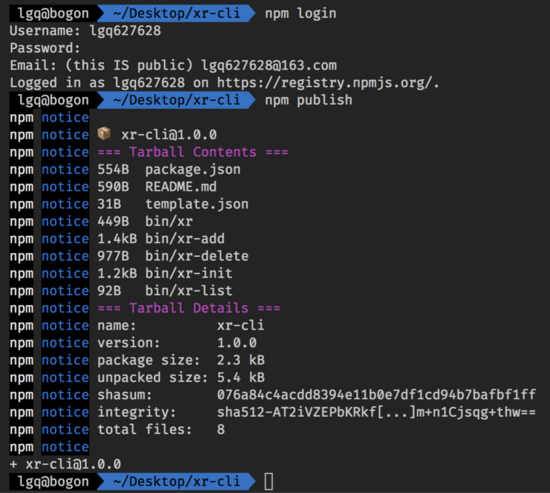 现在让我们回到项目根目录,执行 npm login 登入 npm 账号,再执行 npm publish 发布,就像下面这样: