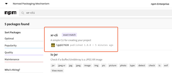 没错,就是这样两个简单的命令,我们就发布成功啦,真是可喜可贺:beer::beer::beer:。大概过一分钟左右(反正挺快的),我们再去 npm 官网搜下 xr-cli,就可以看到自己的脚手架啦,哈哈哈哈,贼开心:+1::+1::+1:。