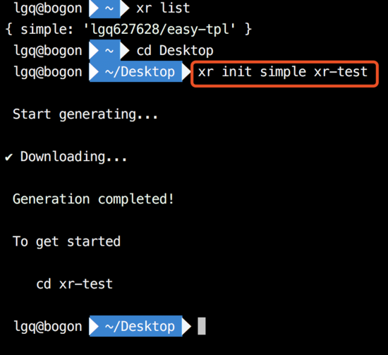 接下来进入到桌面,执行 xr init simple xr-test,不一会就可以在桌面上看到自己的项目啦。