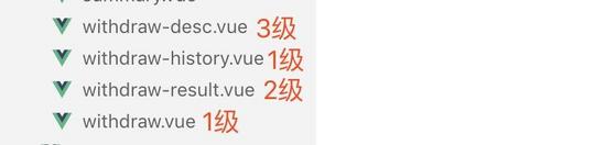 进入提现页面后,会有两处可点击,这两处便是二级页面,放在一级页面的子文件夹中,按刚才的说法,路由目录(截取部分)便是这样